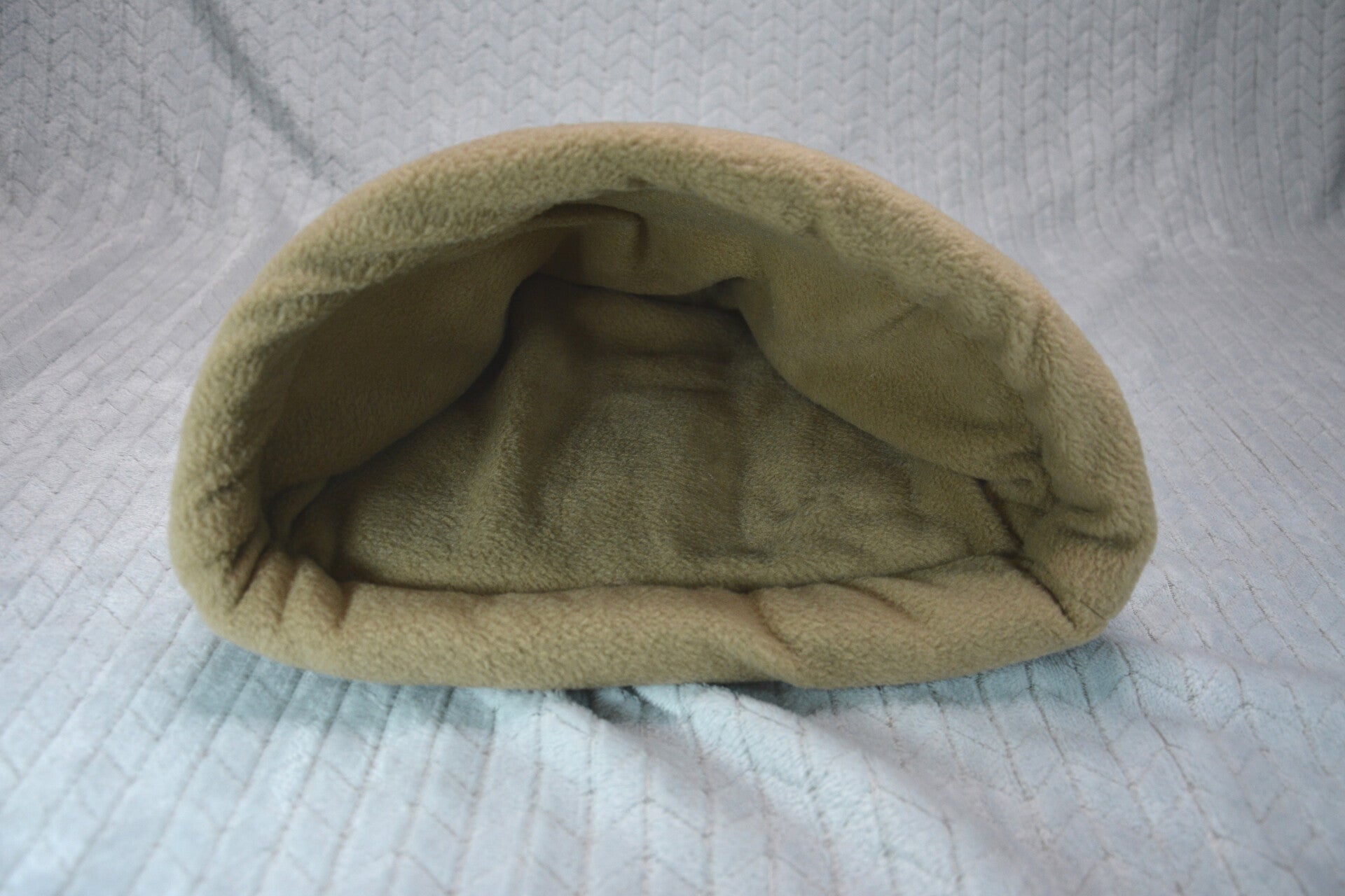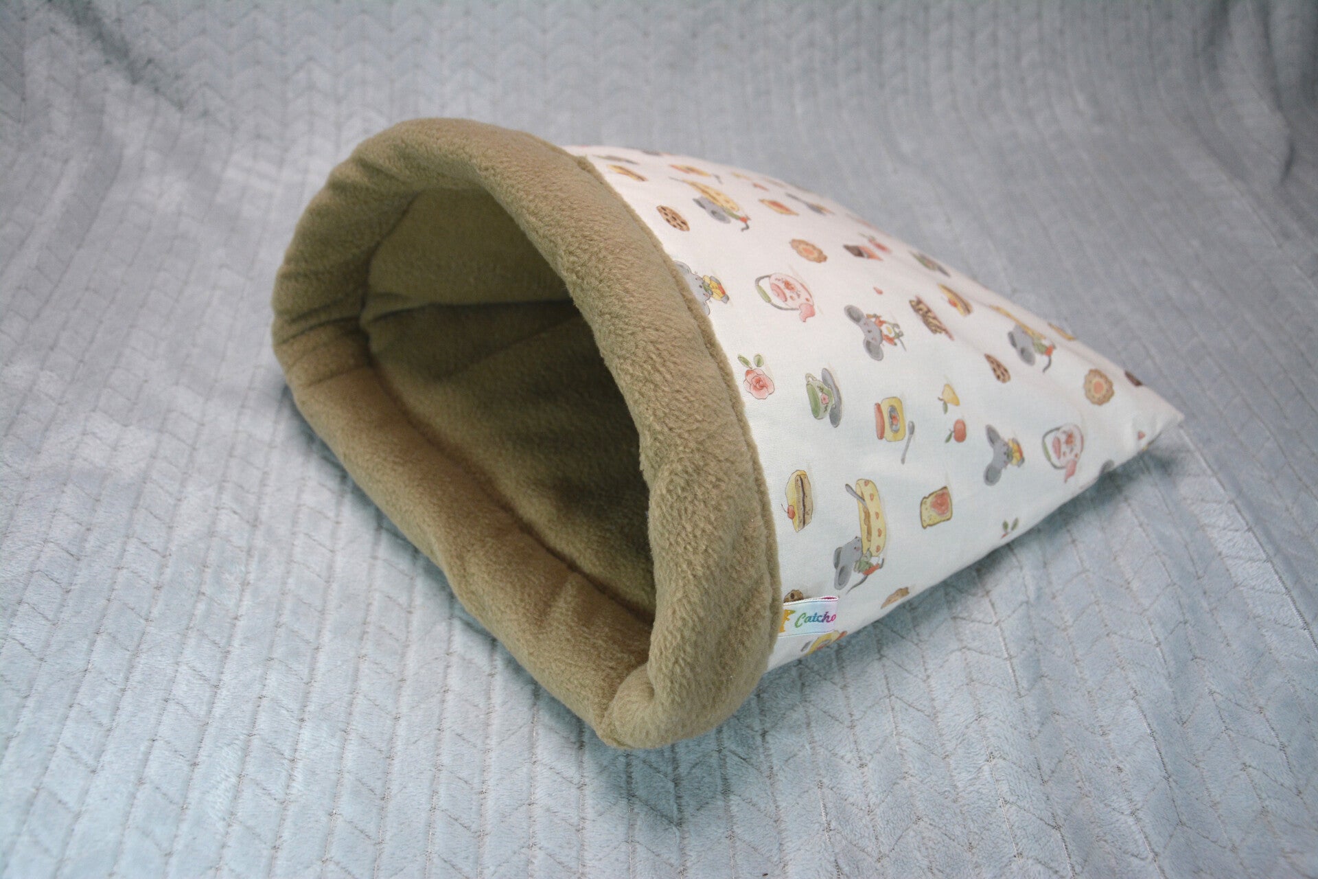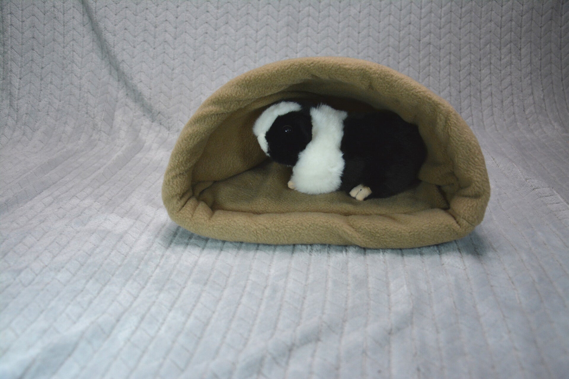La pochette surprise est une cabane confortable à poser au sol, elle tient bien ouverte grâce à son renfort fait de ouate et son armature en plastique sur le devant, de quoi ravir Becky et ses copains ! L'exterieur est en tissu coton et l'intérieur est en polaire, le sol et le pourtour sont rembourrés de ouate. Il y a un arceau en plastique pour un meilleur maintien du bord.
